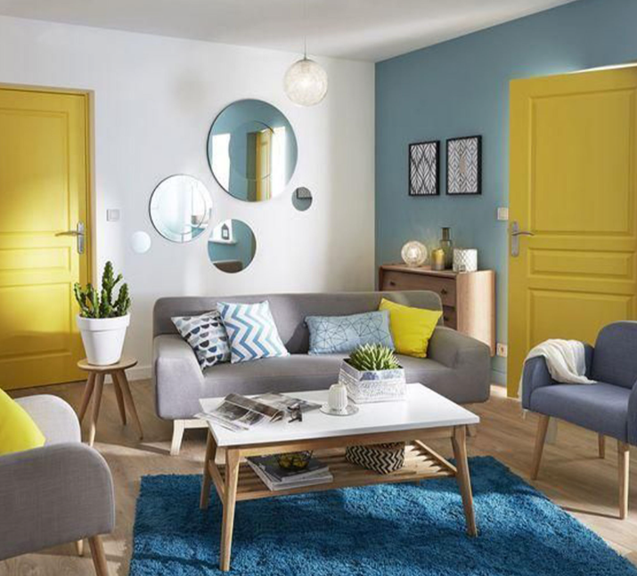 Bộ 3 sắc màu này được xem như một gam màu kinh điển của các thiết kế hiện đại: màu vàng kết với tông xanh tạo hiệu ứng mạnh mẽ, và bắt mắt. Những sắc xanh dịu mát mang lại cảm giác lạnh, còn sắc vàng mang lại cảm giác ấm hài hòa trong tổng thể chung của các gam màu trung tính: trắng, xám,... như một bức tranh tinh giản và đậm chất trẻ trung của gia chủ