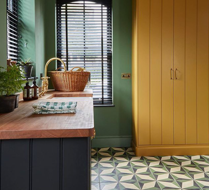 Vàng Copper và Xanh Mallard tươi mát cho phòng tắm