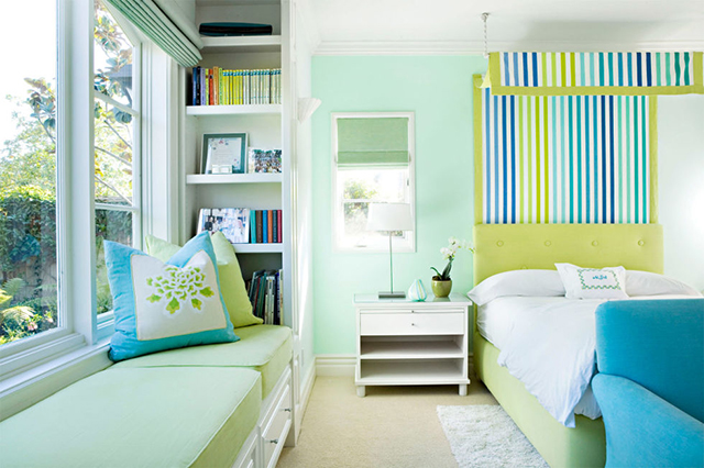 Vẻ yên bình là ưu thế trong ánh sáng của màu này. Sắc xanh mát trên tường kết hợp với họa tiết làm cho không gian của phòng ngủ trở nên bừng sáng và thanh thoát